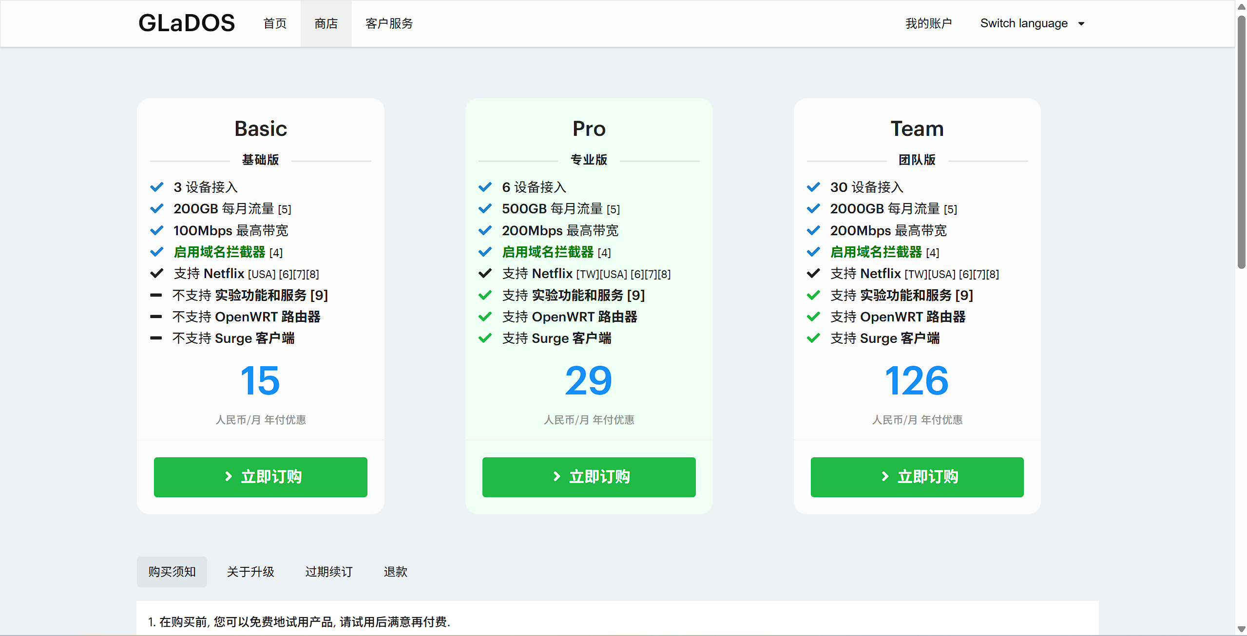 您也可以通过本站专属GLaDOS链接注册(不需要手机号注册),并使用GLaDOS邀请码:GRX9F-FD7RO-0YT19-MI0A7 注册账户,送免费流量,还能享受特别活动优惠。如果平常就是刷刷facebook和twitter,2个外卖的钱就可以拥有Pro专业版的月套餐了,支持6个设备同时在线使用,一个月500G流量,并且还可以解锁Netflix等流媒体视频。如果有长期科学上网需求并且讲究性价比的话,我这里推荐您使用200天或400天的Pro专业版套餐,流量充足,而且套餐价格非常划算,性价比超高。