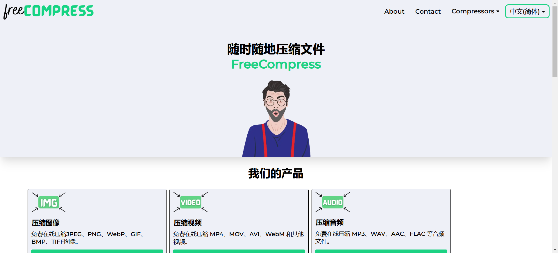 FreeCompress是一个免费在线压缩网站,帮助用户随时随地压缩文件,目前FreeCompress支持图像、视频、音频、文档、代码文件等压缩,免注册登陆即可在线使用压缩工具。